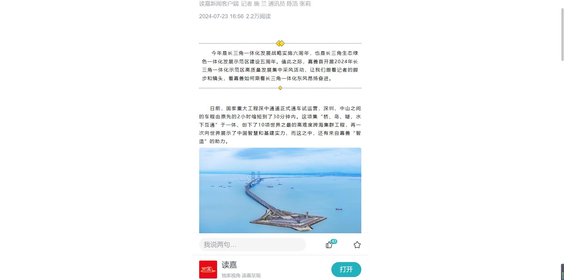 日前,國家重大工程深中通道正式通(tōng)車(chē)試運營,深圳(zhèn)、中山之間的車程由原先的2小時縮短到了30分鍾內。這項集“橋、島、隧、水下互通”於一體、創下了10項世(shì)界之最的高難度(dù)跨海集群工程,再(zài)一次向世界展示了中國智慧和基(jī)建實力,而這之中,還有來自嘉善“智造”的助力。