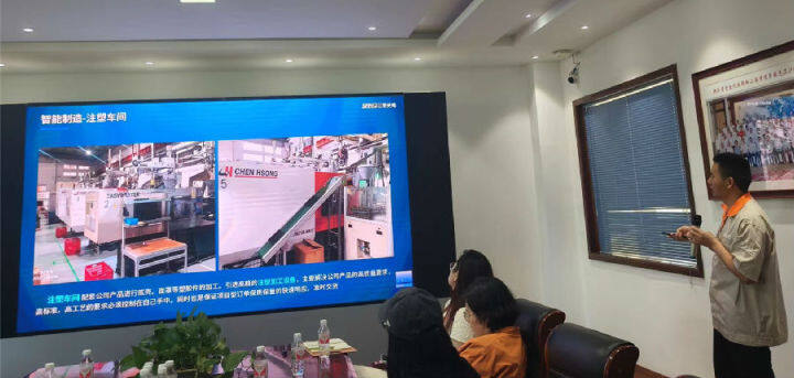 嘉善色多多AV导航光電技術(shù)有(yǒu)限公司技術經理楊順興(右一)介紹企業技術情況 (曾慶華 攝)