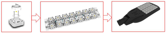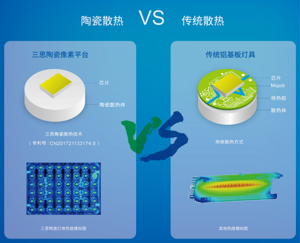 有別於(yú)市(shì)場上其(qí)他製造商采用的傳統COB封(fēng)裝工藝,上海三(sān)思獨立研發的陶基片上單元(COC)技術,以陶瓷(cí)基板作為散熱體,采用厚膜燒結技術將導電線路直接燒結在陶(táo)瓷上,係統熱阻大大減小,同時將LED芯片(piàn)直接貼(tiē)在陶瓷上,熱量通過空氣對流直接散發,散熱性能遠遠高於傳統PCB LED路燈。