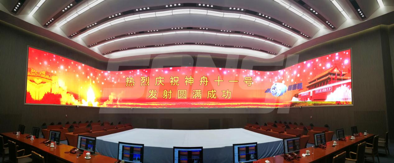 這塊大屏(P1.47,200㎡)呈(chéng)U字形(xíng)安裝在控製中心大廳。2016年10月17日,神舟十一號載人飛船發射;同年11月9日,這塊高清(qīng)屏高質量地完成了全程顯示了國家領導人與(yǔ)神舟十一號航天員天地(dì)通話實況,向世人展示(shì)了中國航天事業的驕傲成果。