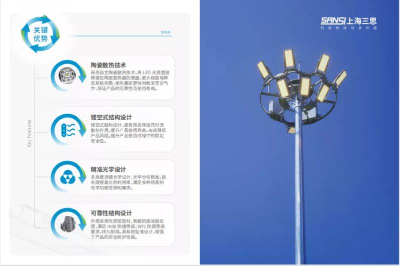廣場高杆燈的,采用(yòng)色多多AV导航獨特技術的LED陶瓷散(sàn)熱投光燈,陶瓷散熱平台與通透式對流散熱結構(gòu),比(bǐ)市麵上常見的傳統鋁基板散熱結構燈具散熱速度更快、散熱性能(néng)更強,顯著提升了廣場高杆(gǎn)燈的發光效率,大大增加其安全可靠性,使用壽命也更長。