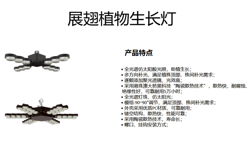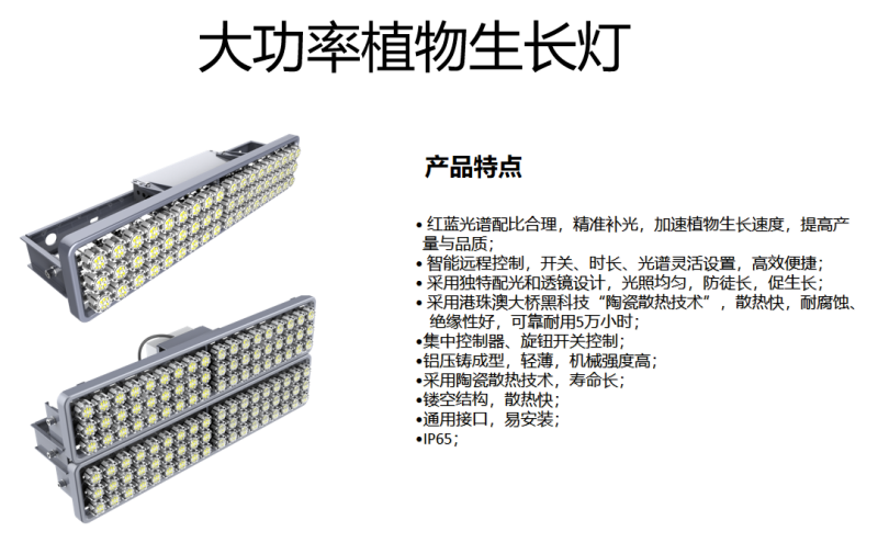 上海色多多AV导航在(zài)植物(wù)照明應用中,先後開發了大功率植物生長燈、色多多AV导航展翅植物生長燈等一係(xì)列植物補光產品,為設施農業提(tí)供一站式植物照明解決方案。