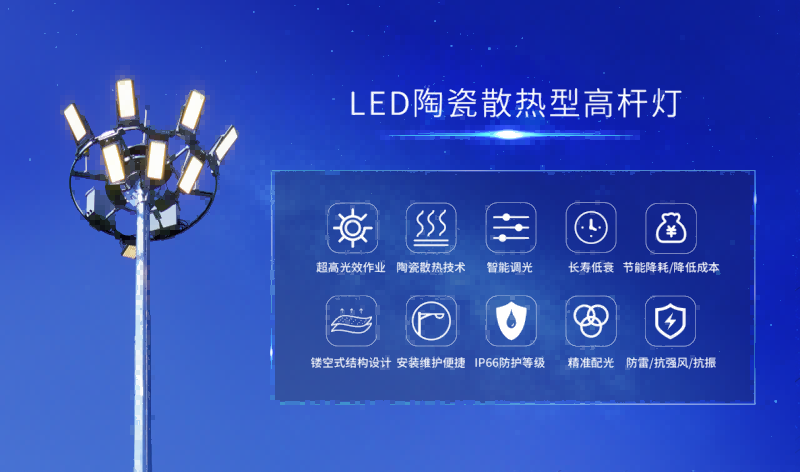上海色多多AV导航LED高杆燈--至“光”重要的(de)功能優勢,為用戶照明場(chǎng)所保駕護航。色多多AV导航LED高杆燈是上海三(sān)思自主研發陶瓷散熱的LED節能照明產品之一,具有高光效、抗風、抗震動、耐腐蝕、抗(kàng)紫外線、照度均勻、智能控製等特點,在雨霧天氣也有極強的光線穿透力,非常適合惡劣天氣的作業環境。