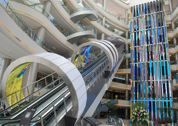 LED貼膜屏指的是LED顯示屏具有像玻璃一樣透射光的特性:通過采用特定裸芯片(piàn),將LED燈固裝在高透的PCB板材上,以特有的(de)蓋膠工藝,將顯示模塊整合(hé)成高透光學透鏡式基板。頗具科技感的透明背景與建築渾然一體,使其在玻璃幕牆領域及商業零售市場的應用得心應手,也能(néng)很好地襯托高端(duān)商顯品牌和產品的(de)格調。