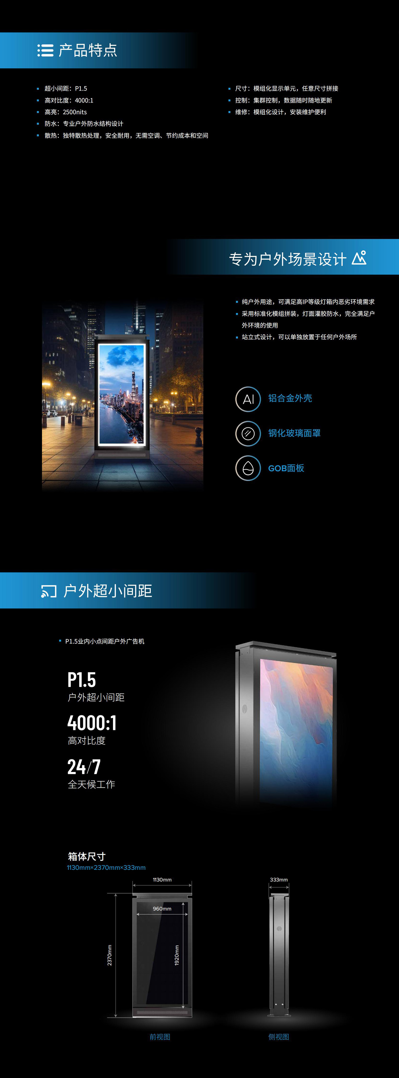在各類公共場合中,相較傳統廣告牌的靜態傳播方式,實時傳輸的動態傳播、高質量的內容傳遞以及受眾互動(dòng)模(mó)式,更能滿足人們對戶(hù)外廣(guǎng)告(gào)的(de)需求。色多多AV导航戶外廣告(gào)機不僅滿足上述條件,它也是一款從細膩的畫質、流暢的刷新率,到高(gāo)對比度,都能讓你大開眼界的小間距戶外(wài)廣(guǎng)告機。強大(dà)的防護性能,更能適應戶外(wài)惡劣的工作(zuò)環境。
